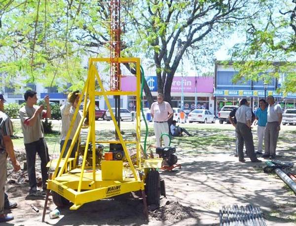 Con una perforadora recientemente adquirida y que tiene como prioridad dotar de agua potable a los productores periurbanos, la Municipalidad de Goya está colocando una electro bomba sumergible en la Plaza Mitre, adquirida con recursos obtenidos con la Feria Franca.