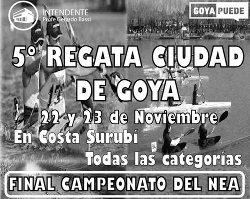La Dirección de Deportes y la Escuela Municipal de Canotaje invitan a la ciudadanía a asistir a uno de los eventos más importantes del calendario deportivo del interior correntino; la 5ta Regata Ciudad de Goya a desarrollarse este 22 y 23 de noviembre en Costa Surubí. La competencia se correrá en el marco de la gran final de NEA, en todas las categorías.