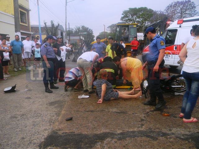 En pleno chaparrón dos motocicletas marca Guerrero Trip impactaron en Avenida Sarmiento y Tucumán, en los rodados iban una anciana de nombre Lourdes Medina de Fernandez, un joven de apellido Segovia y un menor de 8 años, resultando todos con severas lesiones al caer pesadamente en el pavimento. Primeramente fueron asistidos por Bomberos y luego trasladados en ambulancia al nosocomio local. IMAGENES