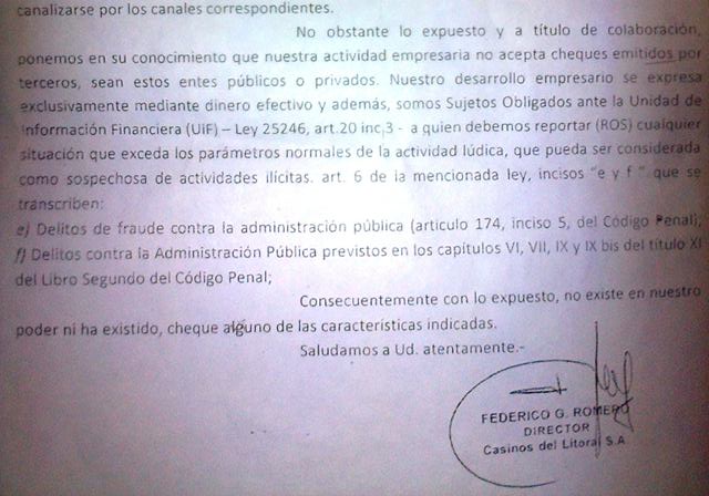 La firma Casinos del Litoral mediante nota enviada al Concejo Deliberante de Goya, desmintió categóricamente que en cualquiera de sus sucursales se hubiera recibido alguna vez cheques de la Municipalidad de Goya, dando por tierra así una de las denuncias mediáticas del ex Viceintendente Darío Zapata. “…no existe en nuestro poder ni ha existido, cheque alguno de las características indicadas”, dicen. Fuentes extraoficiales aseguran que el fiscal Barry perdió tiempo y dinero del estado en esta investigación.