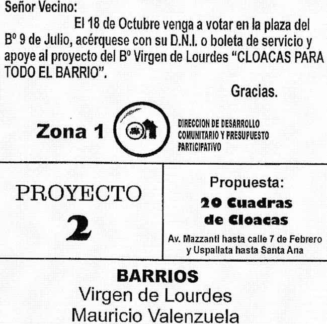 Las comisiones vecinales de los barrios Virgen de Lourdes y Mauricio Valenzuela, invitan a través de este medio, a todos los vecinos de la zona para que se acerquen a votar el proyecto Nº 2, que tiene como propuesta la realización de 20 cuadras de cloacas en el barrio.La respectiva propuesta beneficiará a todos los vecinos que se encuentren comprendidos en dicha zona, que abarca, desde la calle Madariaga y Mazzanti hasta calle 7 de febrero, y desde Uspallata hasta Santa Ana. Los vecinos que se acerquen a votar, deben presentarse con su DNI o una boleta de servicio que justifique el domicilio.