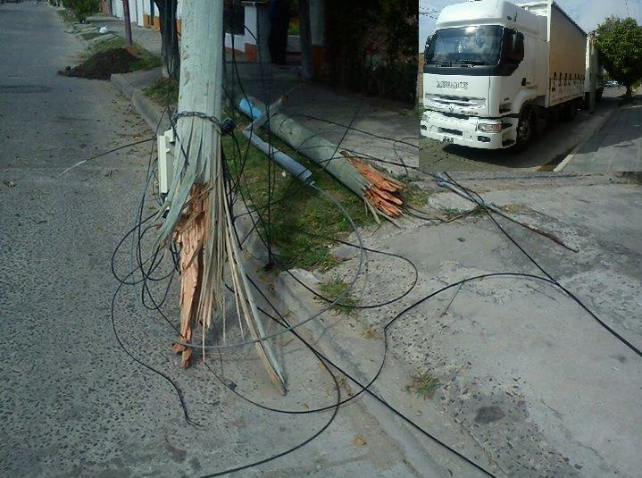 En la mañana del viernes un camión de gran porte con acoplado, arrastro cables y termino derribando un poste, dejando a varios vecinos sin el servicio energético y telefonico. El hecho ocurrió en calle Corrientes entre las intersecciones de Pujol y Berón de Astrada. El camión estuvo varado casi una hora en el lugar. FOTOS