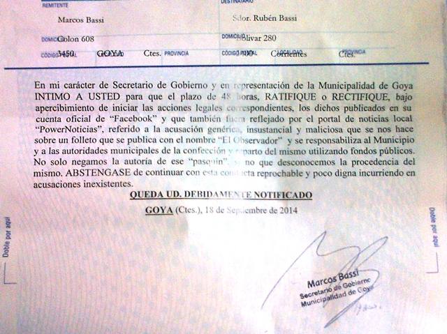 “Estamos cansados de que gratuitamente y en forma irresponsable el Senado Bassi ataque al municipio, inventando cosas que no existen”, aseveró el Secretario de la cartera política de la comuna Marcos Bassi. es por ello que envió carta documento para que ratifique o rectifique sus dichos publicados en su cuenta de Facebook, donde acusa al municipio y a su Intendente de ser responsables de la publicación y distribución del folleto que tiene el nombre de “El Observador”.