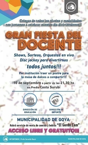 Las Direcciones Municipales de Educación y de Deportes de la ciudad de Goya, están trabajando arduamente en la organización de la Fiesta del Docente que se llevará a cabo el miércoles 10 de septiembre a partir de las 21:30 en el predio Costa Surubí. La entrada será libre y gratuita.