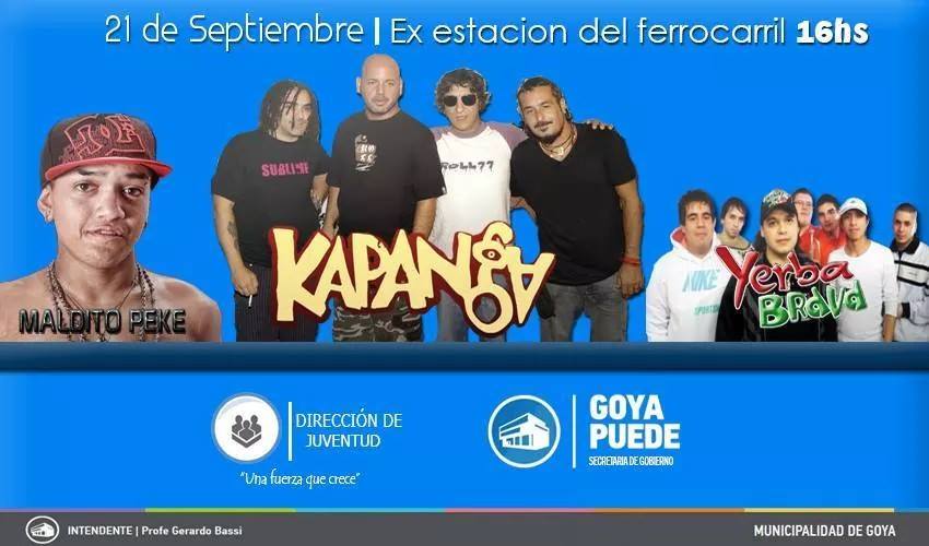 El 21 de septiembre a partir de las 16:00 horas un mega recital para todos los estudiantes de Goya en la estación del ferrocarril con entrada libre y gratuita. Organiza la municipalidad de Goya, Secretaria de Gobierno y Dirección de Juventud Goya. Podes colaborar con alimentos no perecederos, ropas o útiles escolares para la gente de las zonas rurales se los espera para festejar el día del estudiante y de la primavera.