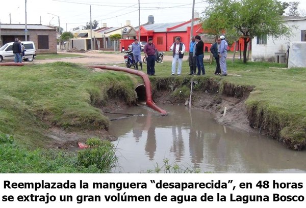 El concejal Ariel Pereira denuncio el robo de más de 5 metros de manguera de la estación de bombeo “Laguna Bosco”, la que ocasiono un retraso en su funcionamiento de más de 12 horas. Dicha manquera en una construida especialmente para las bombas de desagüe. Pereira dijo, “es lamentable y llamativo que estas cosas pasen, el que robo esta manguera sabia las consecuencias que generaba para todo el barrio y la zona”.