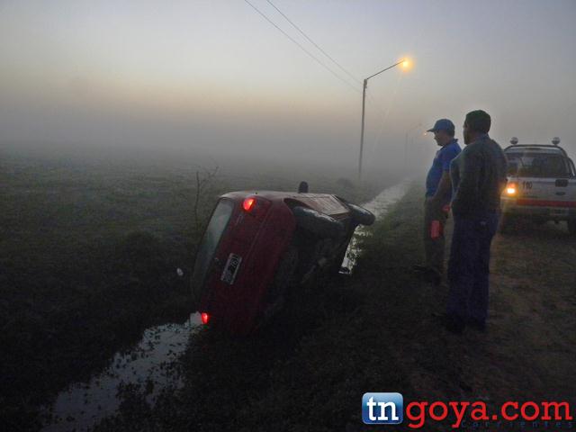 Automovilista despista y vuelca en un zanjón, el hecho ocurrió pasadas las 06 hs de este domingo, el rodado marca chevrolet Corsa circulaba de oeste a este por Avda. Neustad y entre las intersecciones de Mendoza y San Juan, perdió el control al esquivar una motocicleta y termino volcando. El conductor resulto ileso. (Imágenes)