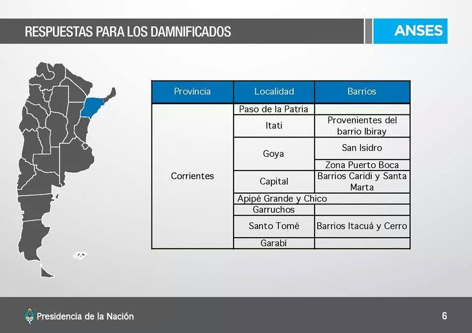 La Presidenta de la Nación, Cristina Fernández de Kirchner, anunció hoy junto al Director Ejecutivo de la ANSES, Diego Bossio, que el organismo previsional brindará ayuda a los damnificados por las inundaciones en las provincias de Misiones, Formosa, Chaco y Corrientes. En el caso de Goya los beneficios serán para los afectados de la zona del puerto y de San Isidro. Los concejales Ariel Pereira y Pablo Monzón destacaron el anuncio de la Presidenta Cristina Fernández de Kirchner que impactara de forma positiva en los Goyanos que más lo necesitan.
