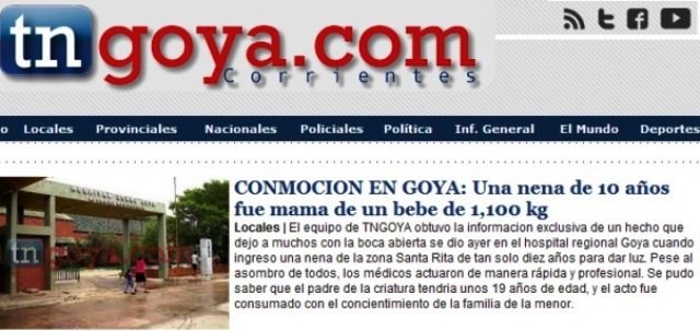 La ciudad de Goya Corrientes está conmocionada por el caso de una niña de 12 años que habría quedado embarazada por su segunda vez a tan corta edad, luego de un año y tras mantener relaciones con un joven de 20 años cercano a su entorno familiar. Se trata nuevamente de Milagros de la 5ta sección Sta. Rita quien estaría gestando un embarazo que llegara a su término en los próximos días.