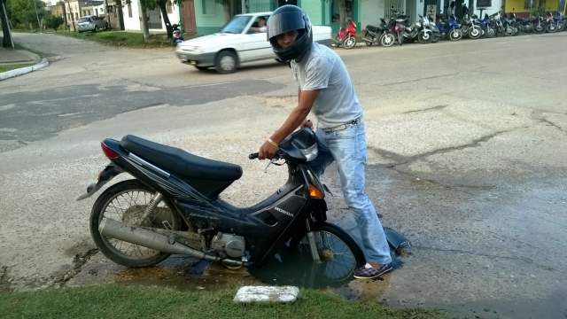 Motociclista se hunde en un bache que dejo Aguas de Corrientes