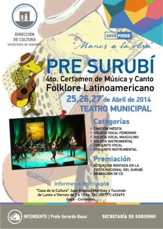 Los días viernes 25, sábado 26 y domingo 27 de abril se realizará en el Teatro Municipal de la ciudad de Goya el certamen de Música y Canto Pre Surubí 2014. Los ganadores actuarán de manera en el Escenario Mayor de la Fiesta Nacional del Surubí y grabarán un CD.