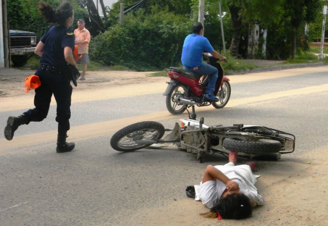 Una joven que transitaba a bordo de una Motocicleta tipo cross de 125 c.c pierde el control del mismo luego de cruzar a gran velocidad lomo de burro ubicado por Avda. Juan Perón al 2400, cae pesadamente al pavimento arrastrándose varios metros con el rodado. Fue asistida por bomberos y trasladada de urgencia al Hospital Regional, se pudo precisar que recibió lesiones en un brazo y pierna. IMÁGENES