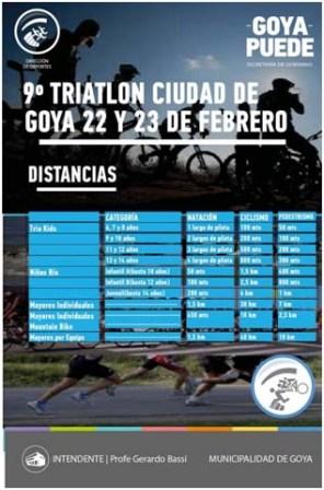 La Dirección de Deportes continúa trabajando intensamente en la organización de lo que será el 9° Triatlón Ciudad de Goya, a realizarse el 22 y 23 de febrero próximo. Ya se acordaron dos circuitos y sus distancias en pedestrismo y ciclismo y las distancias en natación. Se prevé la actuación de artistas y grupos musicales.