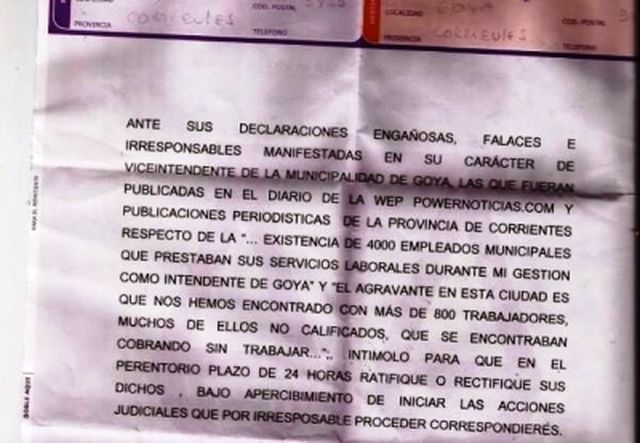 Las declaraciones periodísticas del viceintedente Darío Zapata, que afirman encontraron un municipio sobredimensionado de personal, con el agravante de la existencia de empleados que cobraban sin trabajar, provocó el enojo del exintendente Ignacio Osella quien mediante una carta documento intimó al vicejefe comunal para que se rectifique.