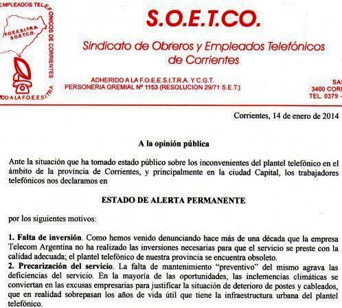 El secretario adjunto del Sindicato de Obreros y Empleados Telefónicos de la Provincia de Corrientes (SOETCO), en comunicación con Radio Dos informó que su gremio se declaró en Estado de Alerta Permante a raíz del colapso del sistema de posteado de cableado de la empresa Telecom, evidenciado en la pasada tormenta.