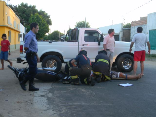 En la intersección de Tucumán y Pedro Ferre motociclista a bordo de una Honda Wave, impacto de lleno contra la puerta derecha de una camioneta Ford 100, resultando con diversas lesiones al caer pesadamente al pavimento, el joven logro frenar pero el rodado se rastro por unos 15 metros y termino chocando, fue asistido por una dotación de bomberos y luego trasladado l nosocomio local. IMAGENES