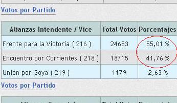 Los datos fueron arrojados por el escrutinio definitivo de la provincia de Corrientes, donde el municipio de Goya se destaca del resto de la provincia por ser el lugar donde más diferencia en votos se le saco a la alianza ECO de Ricardo Colombi. Sin dudas esto refleja una alta adhesión de los Goyanos a encontrar el cambio del manejo municipal donde la diferencia de 15 puntos dejo heridas profundas en el radicalismo local. Frente para la Victoria 55,01 %, Encuentro por Corrientes 41,76 % y Unión por Goya 2,63 %.