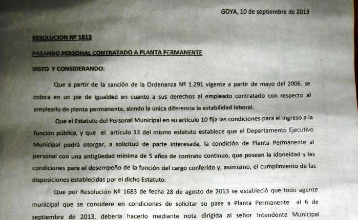 En las últimas horas se dio a conocer un listado de personas que pasaron a planta permanente en el municipio de Goya, que por resolución Nº 1813 y firmada por el Intendente Osella, gozan de e4stabilidad laboral desde el dia 1 de septiembre. Esto causo malestar y rechazo en municipales, donde en dicho listado figuran funcionarios de alto rango, punteros políticos y ex vecinalistas. Desde el concejo deliberante adelantaron, revisaran cada uno de los pases a planta permanente. A continuación la resolución y listado.