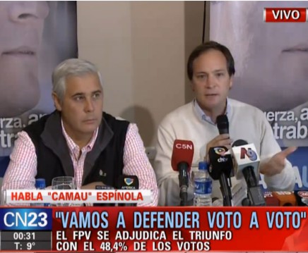 El candidato a gobernador de la provincia de Corrientes por el Frente para la Victoria, Carlos Mauricio Espínola se adjudicó el triunfo del FpV y advirtió que el oficialismo provincial toma como una herramienta al Centro de Cómputos que demora arbitrariamente el recuento provisorio y la carga de datos. En éste sentido dijo que nos llama la atención el proceso de carga de ellos y nosotros tenemos otros números. Por eso "queríamos informarles, nosotros llevamos cargadas 1072 mesas (un 48.66%) lo cual da en candidato a gobernador por ECO 47.9 y FPV 48.4 y a intendente FpV 48.3 y ECO 47.1.
