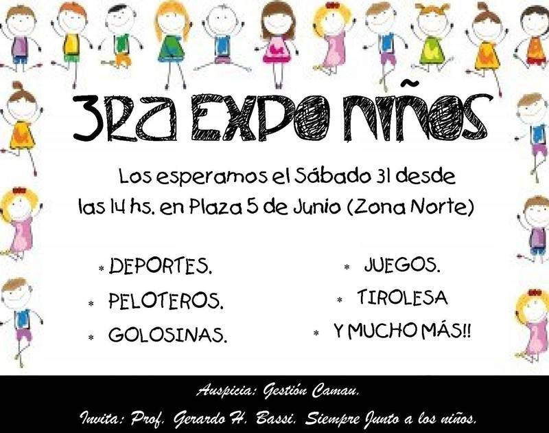 Este sábado 31 de agosto el profesor Gerardo Bassi y el doctor Darío Zapata invitan a las familias goyanas a la tercera Expo Niño a realizarse en la Plaza 5 de Junio, entre las Calles Ñaembé y Batalla de Caseros. A partir de las 14 hs juegos de aventura, actividades recreativas, deportivas y culturales, peloteros, música en vivo, chocolate, facturas, sorteos, entre otras actividades, habrá para las familias que se acerquen a compartir la jornada.