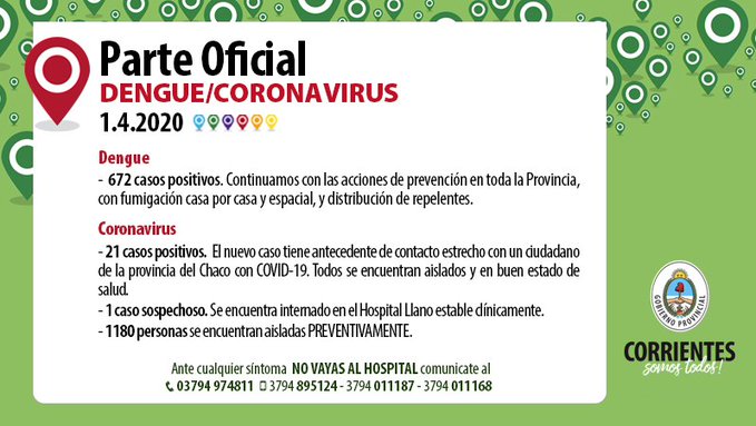 Un caso nuevo de COVID-19 se registró en Corrientes, prácticamente con el mismo origen de diez de ellos. Se trata de una persona con estrecha relación con otra que reside en el Chaco afectada por el virus, esto eleva a la decena los contagios con el mismo origen.