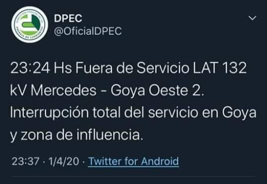 Un gran apagón vivió en horas de la noche la ciudad de Goya, donde a las 23:24 horas, salió de servicio la línea de alta tensión 132 KV – Goya Oeste 2, con una interrupción del servicio en su totalidad. Hasta el momento no se saben las causas de dicho corte que duro aproximadamente 1 hora.