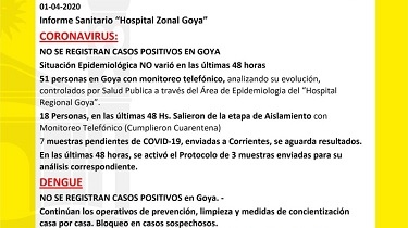 En las últimas 48 horas 51 personas de Goya siguen con monitoreo telefónico, controlados por el Área de Epidemiología del Hospital Regional Goya. 18 personas salieron de la etapa de aislamiento; 7 muestras pendientes enviadas a Corrientes, aguardando su resultado. Otras tres muestras fueron enviadas para su análisis correspondiente.
