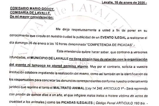Desde el Municipio desmentimos categóricamente tener algún tipo de relación con la organización del supuesto evento que se realizaría próximamente. Además recordamos que dicho evento es ILEGAL ya que no se otorgó permiso alguno, y se solicita a las autoridades policiales que intervengan e impidan la realización del mismo. Está vigente un ordenamiento jurídico que reprime tanto el maltrato animal (Ley 14346 ) como así también las picadas ilegales (Código Penal 193 bis) con sus respectivos cargos.