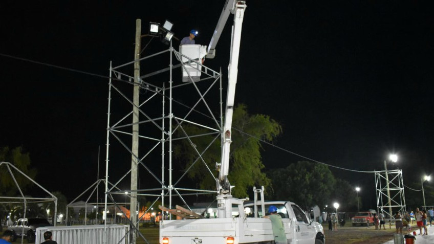 El martes a la noche, una hidroelevadora con operarios técnicos municipales realizaron tareas de ajuste y consolidación del sistema de iluminación del circuito de 320 metros de extensión del Corsódromo.