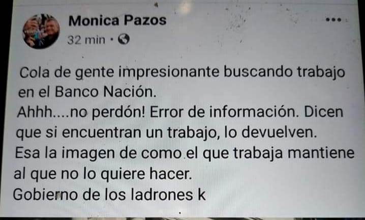 Radios DOS de Corrientes capital público en su página web las declaraciones de la funcionaria municipal. Mónica Pazos realizó un comentario inapropiado contra la gente (jubilados, pensionados y beneficiaros de la AUH) que ayer realizaba la fila para cobrar el bono anunciado por el Gobierno Nacional. “Cola de gente impresionante buscando trabajo en el Banco Nación”, comienza diciendo Pozos en una publicación hecha en su Facebook. Luego agrega, de manera irónica, “ahh, no perdón. Error de información. Dicen que encuentran un trabajo, lo devuelven”. El posteo fue borrado por parte de Mónica Pozos, que, según información de su perfil, es coordinadora de Turismo en el municipio de Goya y militante del partido U.C.R. El INADI inicio investigación de oficio.