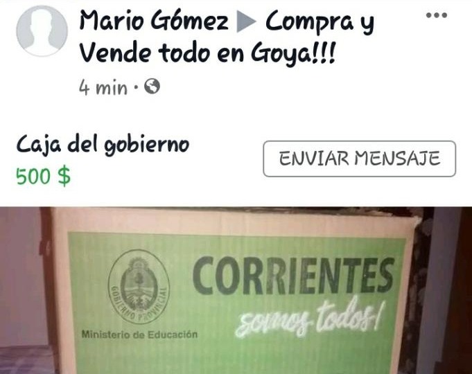Si bien en los últimos tiempos la necesidad de la gente puede originar cualquier alternativa para salir de la crisis, hay cosas que superan la realidad. En una cuenta de Facebook de compras y ventas, ofrecen en Goya "cajas del Gobierno" y hasta publican la foto . "Caja del Gobierno, a 500 pesos", pública la nota. La oferta causó impacto en la ciudad y la gente pide se busque a los responsables de controlar las distribuciones para evitar ésta anormalidad.
