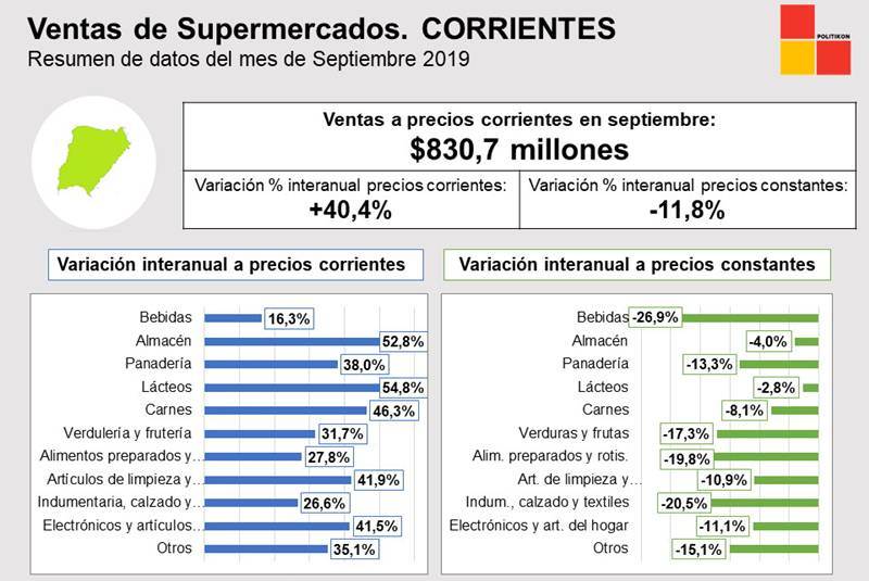 La provincia de Corrientes, durante el mes de septiembre de 2019, tuvo ventas en supermercados por un total de $830,7 millones de pesos, que significa un incremento respecto al mismo mes del 40,4%; mientras que, comparado con agosto, creció un 3%, siempre medidos a precios corrientes.