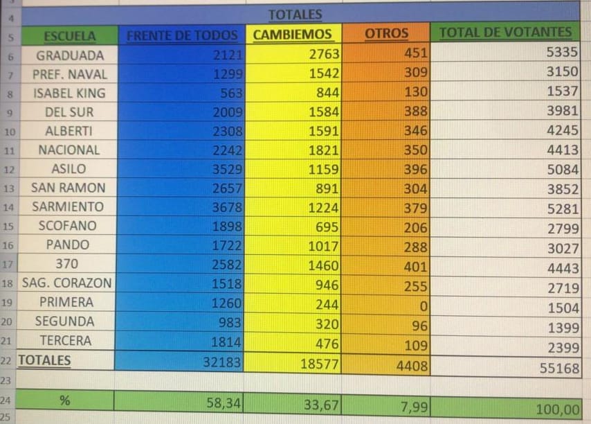 De 16 escuelas habilitadas para votar, tanto en ciudad como zona rural la formula Fernández - Fernández gano en 13 escuelas, además arraso en el campo. Los resultados finales arrojaron 32.183 votos para el Frente de Todos y para Juntos por el Cambio 18.577, el resto de los candidatos 4.408. En porcentaje fue el 58,34% para FF y el 33,67% para MM.