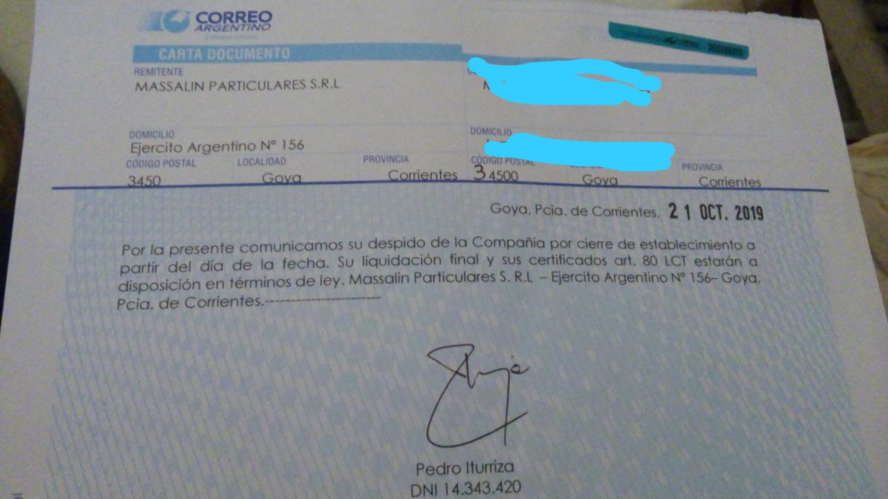 Esta es la carta de despido que recibieron los obreros de Massalin