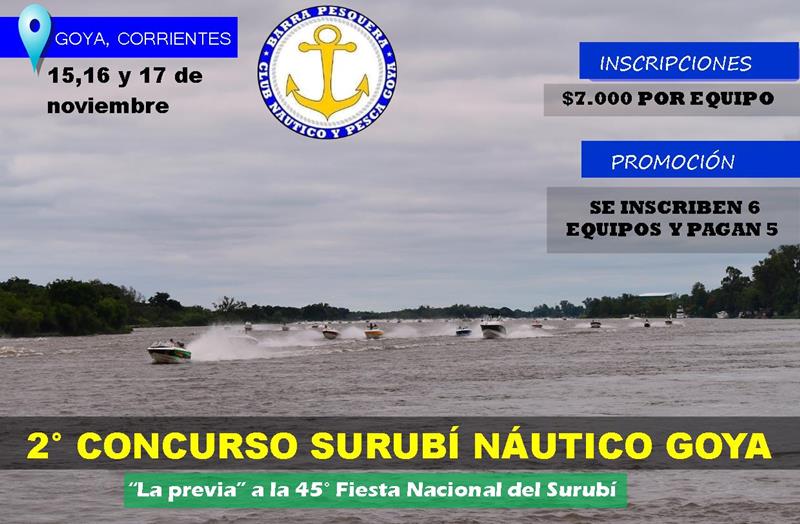 En Goya se realizará del 15 al 17 de noviembre el 2º Concurso Surubí Náutico “La previa”, con importantes premios a repartir entre los ganadores de zona, dama mejor clasificada y surubí mayor entre otros. Desde la organización detallaron que hasta el 16 de noviembre inclusive los equipos tendrán tiempo de inscribirse.