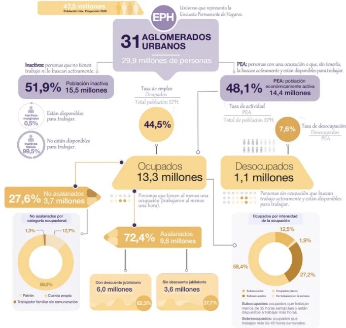Durante el segundo trimestre del 2025, la desocupación se ubicó en el 7,6% de la población, el mismo registro que en igual período de 2024, de acuerdo con el informe difundido por el Instituto Nacional de Estadística y Censos (INDEC). La cifra equivale a unos 1,7 millones de personas que no logran acceder a un empleo.