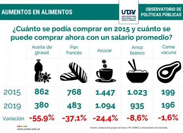 El estudio del Observatorio de Políticas Públicas de la Universidad Nacional de Avellaneda (UNDAV) mostró la pérdida de poder adquisitivo de los salarios en los últimos 4 años, a través de 5 alimentos fundamentales: aceite de girasol (-55,9%), pan francés (-37,1%), azúcar (-24,4%), arroz blanco (-8,6%), carne vacuna (-1,6%).