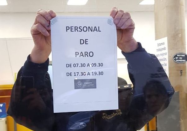 El sindicato Foecyt (Federación de Obreros y Empleados de Correos y Telecomunicacione) de trabajadores de Correo, realiza una medida de fuerza en reclamo de mal manejos de la bolsa de trabajo por parte de la empresa y falta de reposición de indumentaria laboral en distintos puntos del país. Por lo que no atienden al público de 7:30 a 9:30 y de 17:30 a 19:30, de la jornada de hoy, realizan retención de servicios en el lugar de trabajo y quita de colaboración a la empresa.