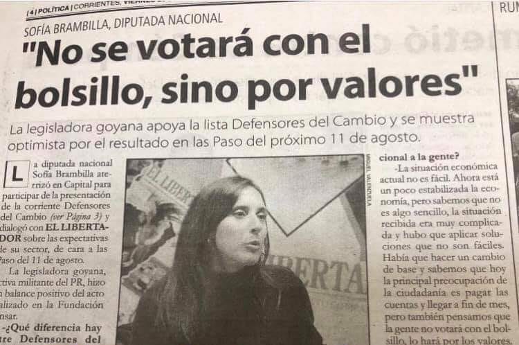 La diputada nacional goyana Sofía Brambilla quien apoya la lista Defensores del Cambio, se muestra optimista por el resultado en las Paso del próximo 11 de agosto, afirmo que "hay que aguantar y tener paciencia ya que el presidente Macri es el primero que quiere soluciones para la población". Las redes sociales por su parte criticaron fuertemente las declaraciones de la diputada, quien ademas pidió votar no por el bolsillo sino por los valores en la provincia mas pobre de la Argentina.