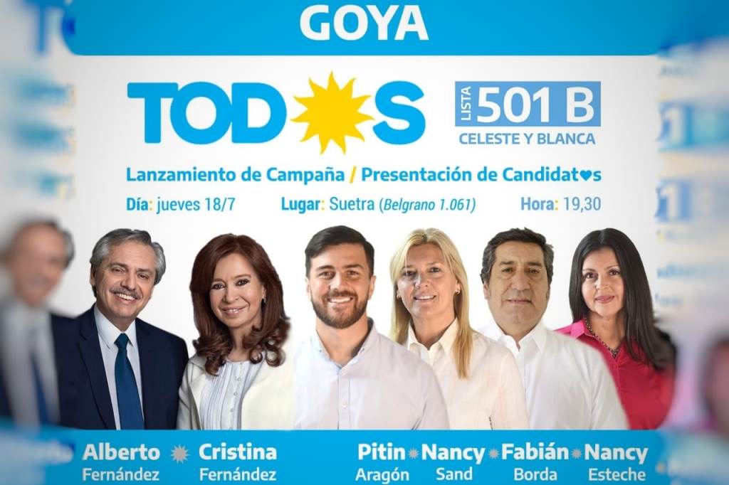 La fuerza política que agrupa a todas las fuerzas del peronismo local, unidos para acompañar a Alberto Fernández y Cristina Fernández de Kirchner, presentará sus candidatos a diputados nacionales en Goya, este jueves 18 de julio a las 19:30 en Belgrano 1.061 (SUETRA).
