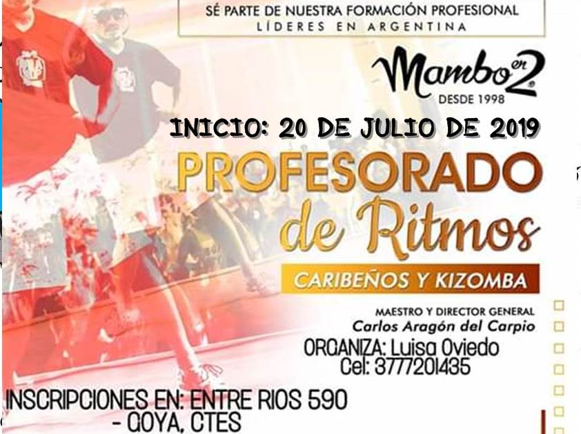 Este sábado inicia en nuestra ciudad el profesorado de ritmos caribeños y kizomba organizado por la instructora Luisa Oviedo. Cuentan con el aval de la academia Mambo en 2 el cual estará a cargo del maestro y director Carlos Aragón del Carpio. No dejes pasar esta oportunidad y forma parte del baile. Para inscripciones acércate a Entre Ríos 590 o comunícate al 3777-201435.
