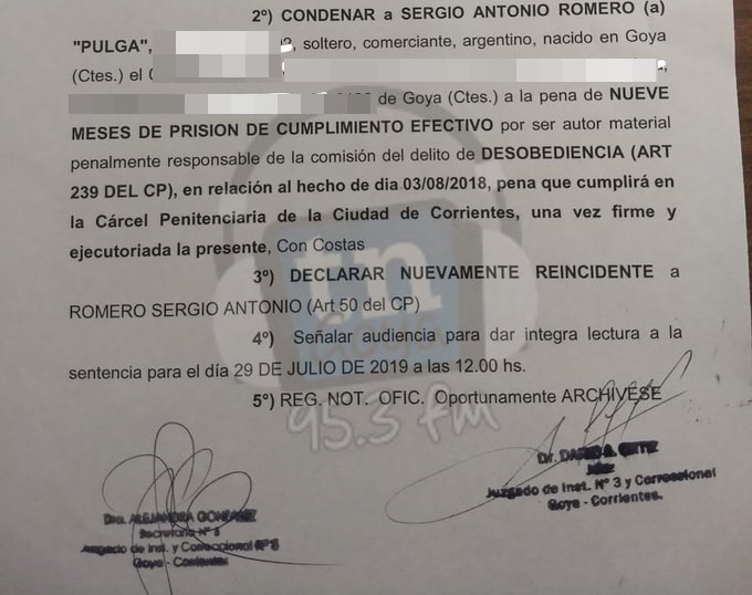 El Juzgado Correccional N°3 de Goya, condeno a la pena de nueve meses de cumplimiento efectivo a un sujeto por violar una perimetral impuesta por violencia de genero a su ex pareja. El hecho fue el 8 de agosto del 2018, cuando la víctima debió llamar a la policía por el hostigamiento que recibía y el acusado huyo al presenciar la policía. Una vez firme deberá cumplir en una cárcel de la capital.