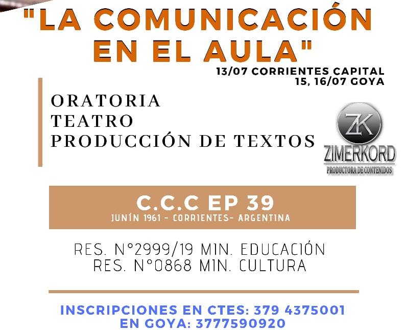 El Centro Cultural Correntino y la fundación Zimerkord brindarán un curso de capacitación docente en la ciudad de Goya con el nombre "La comunicación en el aula". El mismo se llevará a cabo en el salón blanco de la escuela normal los días 15 y 16 de Julio. Para inscripciones e informes comunicarse al 3777590920.