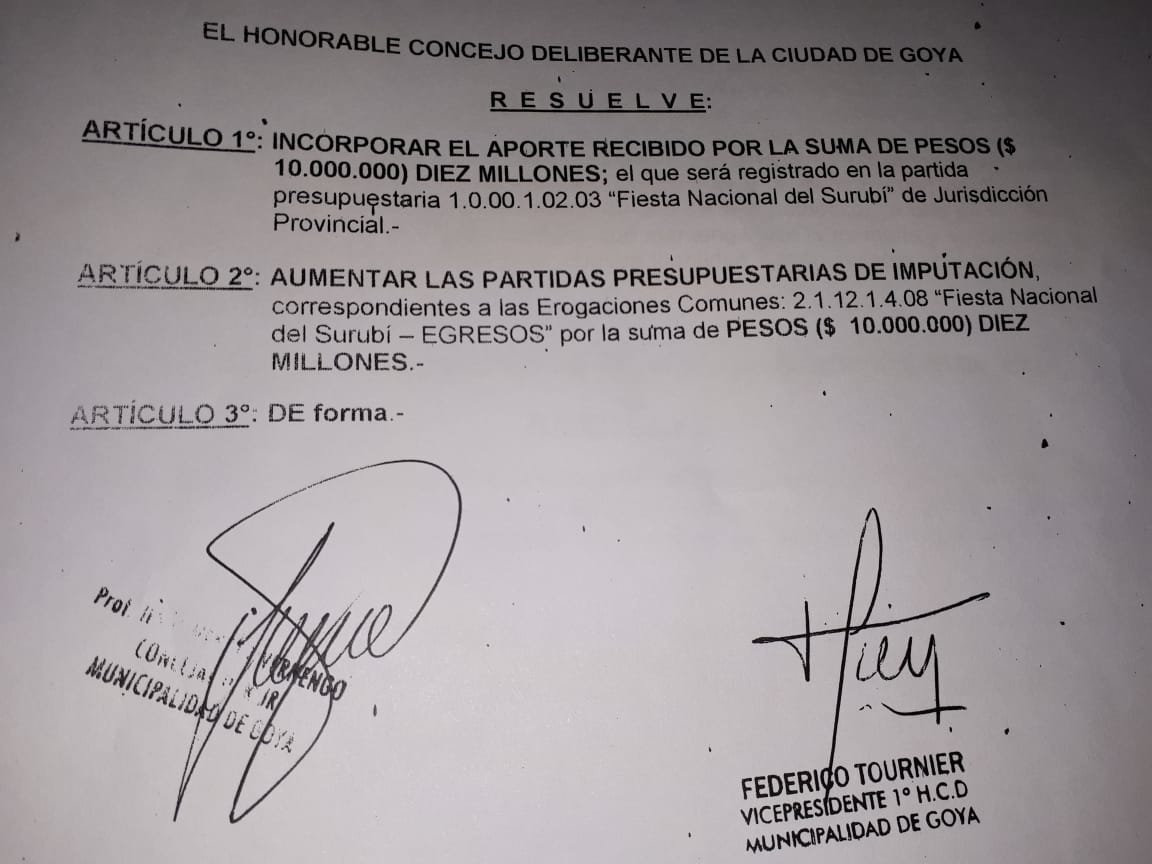 Mediante expediente Nº 2.880/19 el concejo deliberante local tratara la incorporación del aporte del gobierno de la provincia a la fiesta nacional del surubi, por un monto de $10.000.000, además de otros $425.000 que se agregan a las partidas presupuestarias.