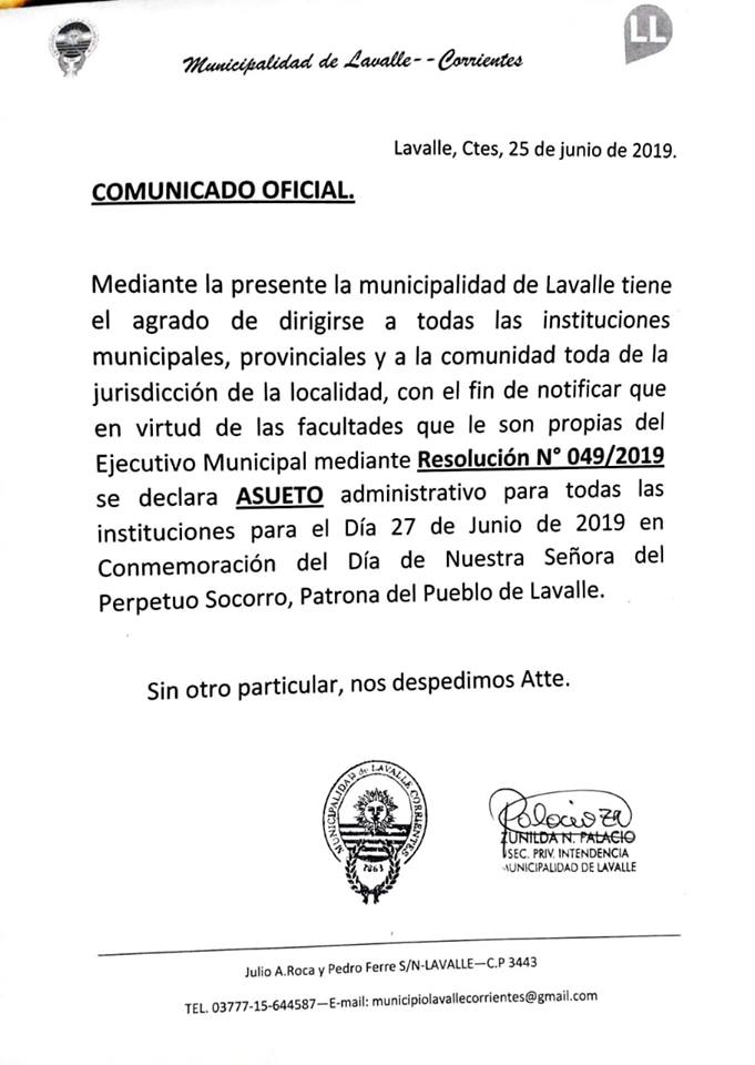 El poder ejecutivo municipal de Lavalle por resolución N° 049/2019 declara asueto