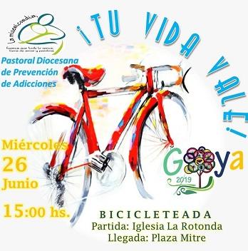 En el marco del día internacional de la lucha contra el uso Indebido y el Tráfico Ilícito de Drogas, que la Asamblea General de Naciones Unidas decidió conmemorar el 26 de junio, la Pastoral Diocesana de Prevención de Adicciones organiza una “bicicleteada” con el lema “TU VIDA VALE” con el objeto de concientizar y sensibilizar al respecto.