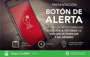 La Dirección de la Mujer a cargo de Mónica Celes, comunicó que el próximo viernes 28 de junio, a las 17 horas, en el Colegio Secundario Goya, Baibiene 850, se realizará la presentación del Botón Alerta que se implementará próximamente en nuestra ciudad, a fin de dar mayor contención a las víctimas que sufren violencia de género.