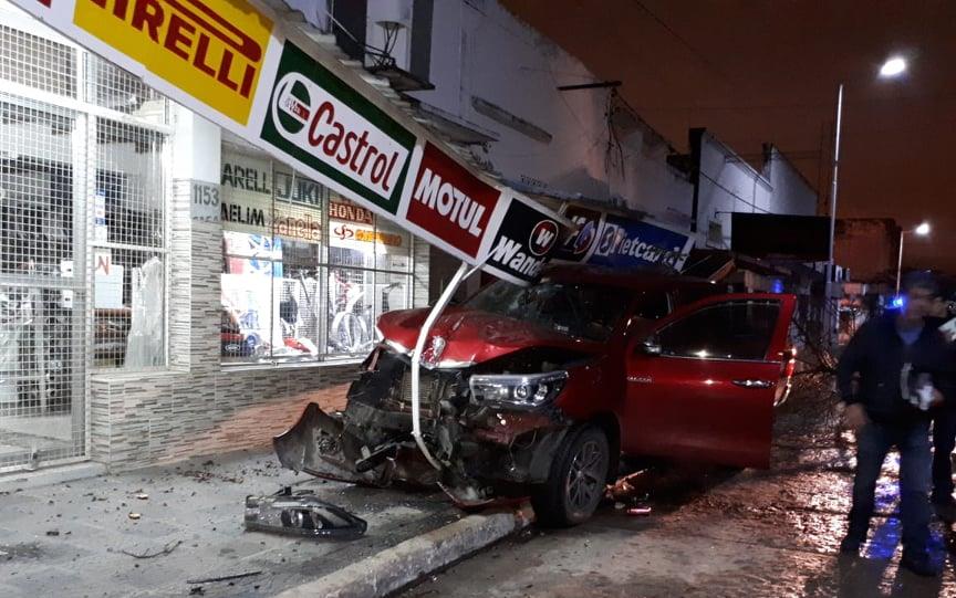En la madrugada del domingo en José Gómez al 1150, conductor de camioneta, subió a la vereda, arrancó un árbol, tiró abajo techo externo de un local y daño a otro que podría caer, dejando el paragolpes incrustados en una de las columnas. El propietario del rodado sería de apellido Álvarez, aunque él no guiaba el vehículo aparentemente. Mirá las imágenes.