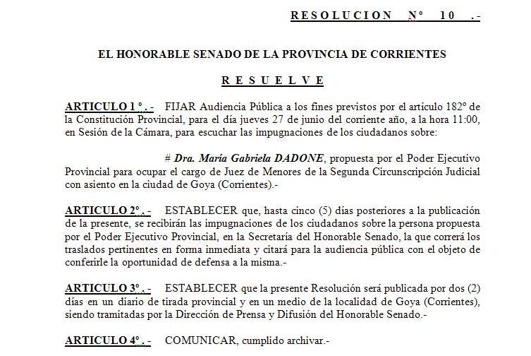 Llamado audiencia pública en el senado para cargo de juez en Goya