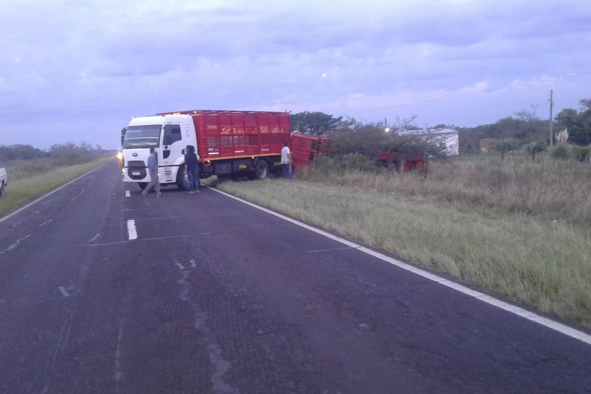 Conductor de camión jaula vacío se durmió al volante y volcó su acoplado